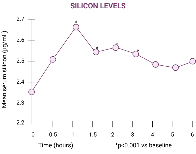 In an open label study, healthy adults took 1,500mg of Bonded Arginine Silicate for 14 days. On Day 14, serum silicon levels significantly increased from baseline within 1 hour of consumption and remained elevated for several hours after consumption.