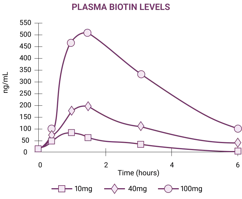 In an open-label human clinical study, Magnesium Biotinate at 10mg, 40mg, and 100mg effectively increased plasma biotin levels within 1 hour of intake.